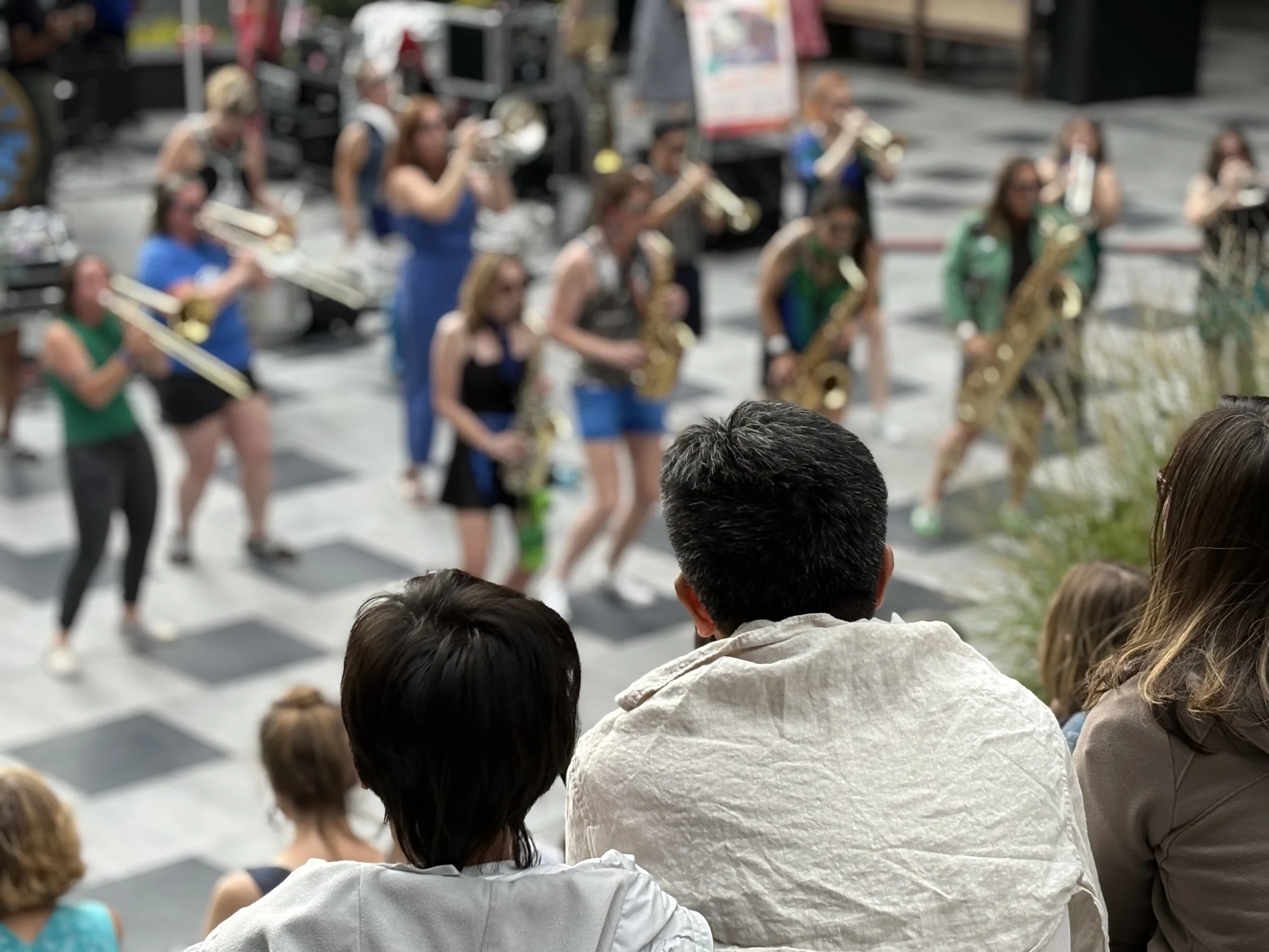 On Day 3 we set up, with the help of Luke Kehrwald and Performance Sound, a remarkable afternoon of music. Pre-teen grunge rockers, followed by classical strings, a European Opera diva and the incredible Filthy FemCorps – a female, non-binary and trans marching band. I mean, come ON!! Tons of Seattle visitors sat at the amazing Harbor Steps (SUCH a great partner!) and swayed, bopped, danced and smiled at the most eclectic combination of fabulous musicians we could assemble. And it came off beautifully!! Thank you to Seattle Drum School for showing up in such a big way!